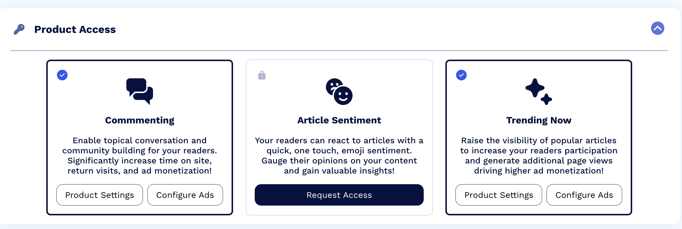 Visitors who do not have access to Trends and Reactions can request access on the respective Request Access page. The Account Manager will grant access to configure and download the code.