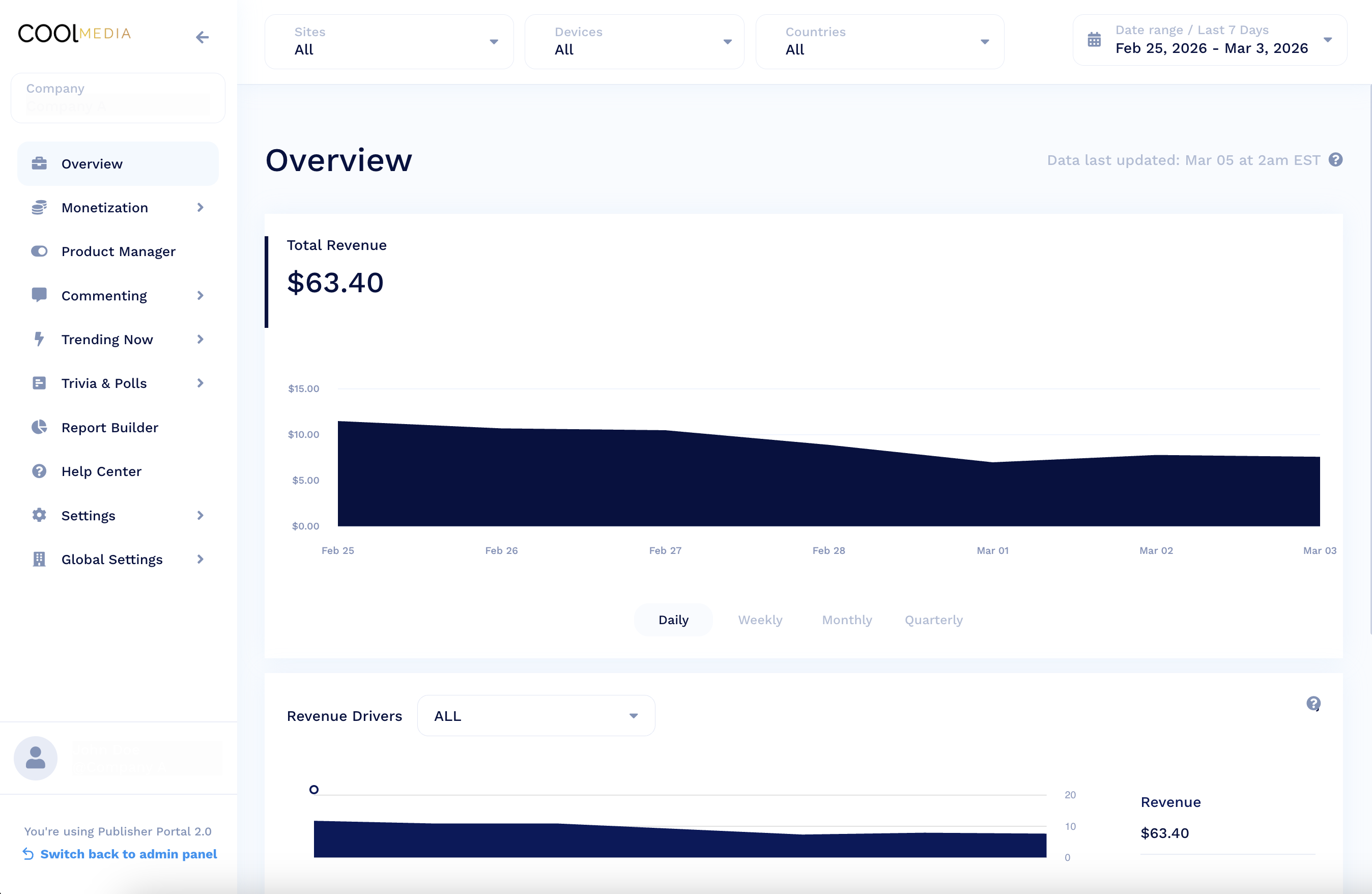You can view Commenting, Trending Now, and Trivia & Polls Configuration and Analytics.